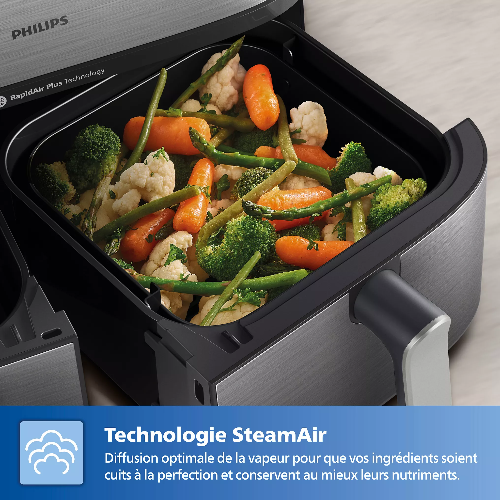 L’Airfryer PHILIPS Série 5000 Double bac 9,0L NA555/00 innove avec sa fonction vapeur, permettant une cuisson saine et savoureuse. Grâce à la technologie Air Steam, vos ingrédients sont cuits à la vapeur, préservant ainsi jusqu’à 87 % des nutriments par rapport à une cuisson traditionnelle à la casserole.