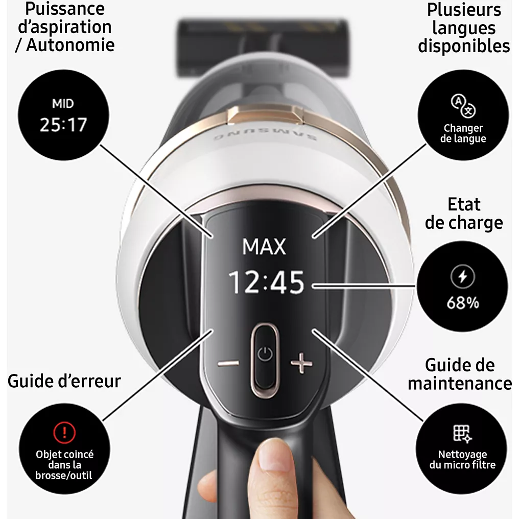 Sa poignée ergonomique et ses commandes intuitives garantissent une utilisation agréable, même lors de longues sessions de nettoyage. De plus, les LED intégrées éclairent les zones sombres, révélant la poussière invisible et facilitant le nettoyage sous les meubles et dans les recoins.