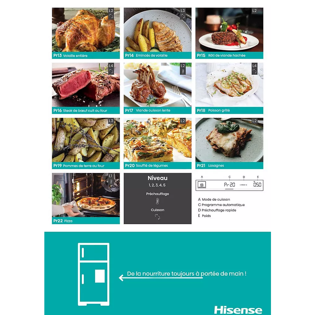 Le Four encastrable HISENSE O643PG combine technologies modernes et confort d’utilisation pour transformer votre façon de cuisiner. Avec sa fonction vapeur intégrée, sa grande capacité et ses multiples modes de cuisson, ce four vous permet de réussir des plats variés — du pain croustillant aux gratins, en passant par les viandes juteuses ou les légumes fondants — tout en préservant les saveurs et les textures.