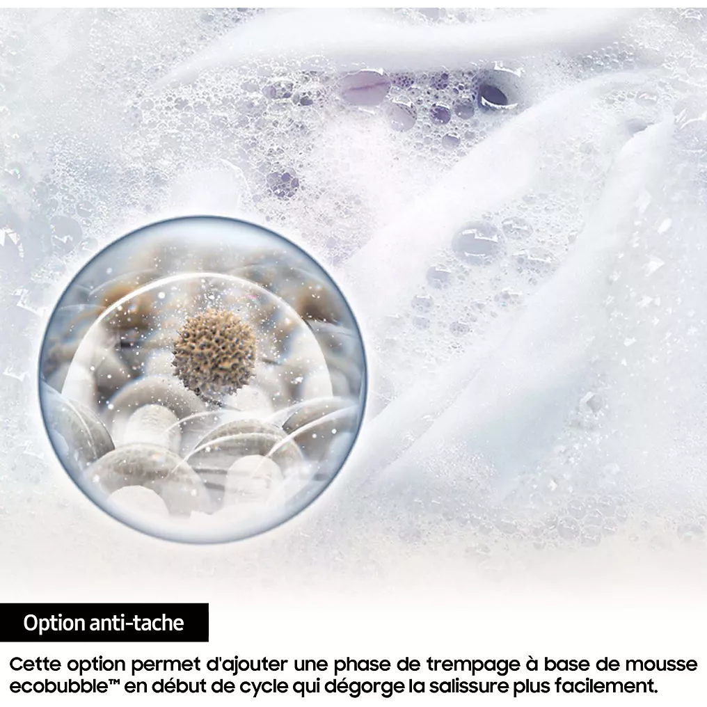 Le système “EcoBubble” mélange lessive, air et eau pour former une mousse active. Cette mousse pénètre rapidement les fibres. Elle permet de laver efficacement même à basse température.