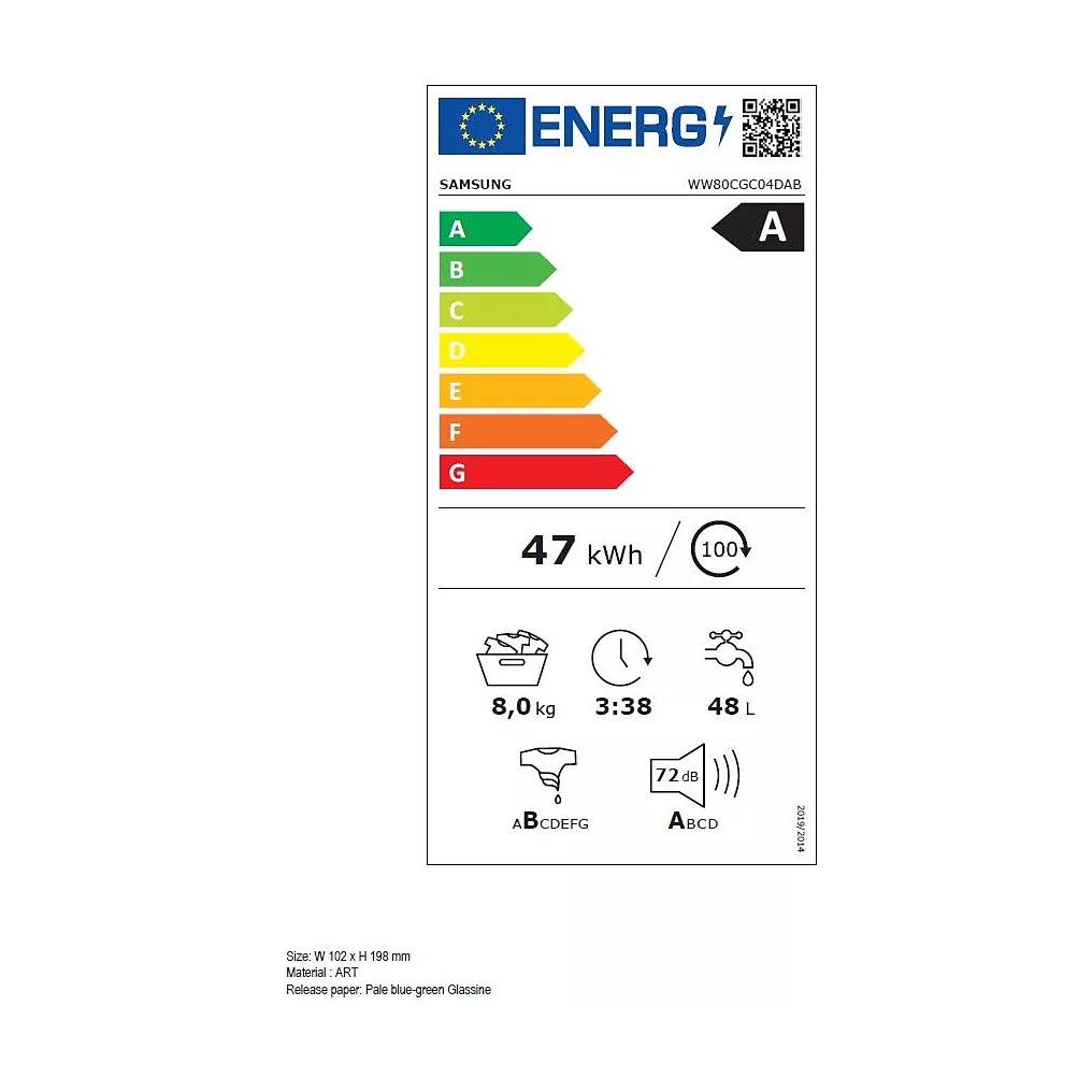 Avec sa capacité de 8 kg, le WW80CGC04DAB gère sans peine les lessives quotidiennes : vêtements, sous‑vêtements, serviettes, linge de maison. Cette contenance convient parfaitement aux couples, petites familles ou utilisateurs réguliers.