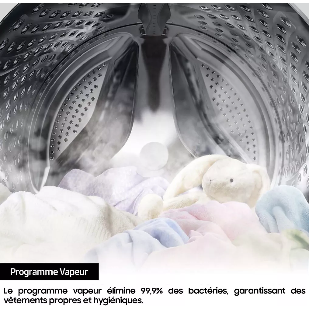 - Lavage vapeur en profondeuroui, idéal pour une hygiène parfaite et les personnes allergiques, élimine jusqu’à 99,9% des bactéries de votre linge grâce à la combinaison de la vapeur et du lavage à haute température.