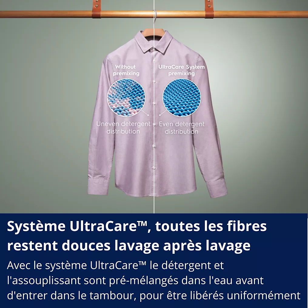 - UltraCarepermet de mélanger en début de cycle la lessive et en fin de cycle l’adoucissant à l’eau pour une meilleure répartition des produits et un lavage optimisé.