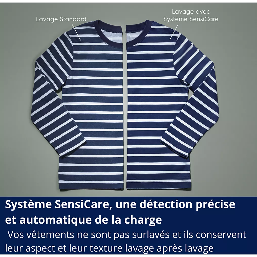 - SensiCareajuste automatiquement les réglages du cycle en fonction de la charge de linge, permettant ainsi de réduire la durée et la consommation en eau et énergie pour de petites charges.
