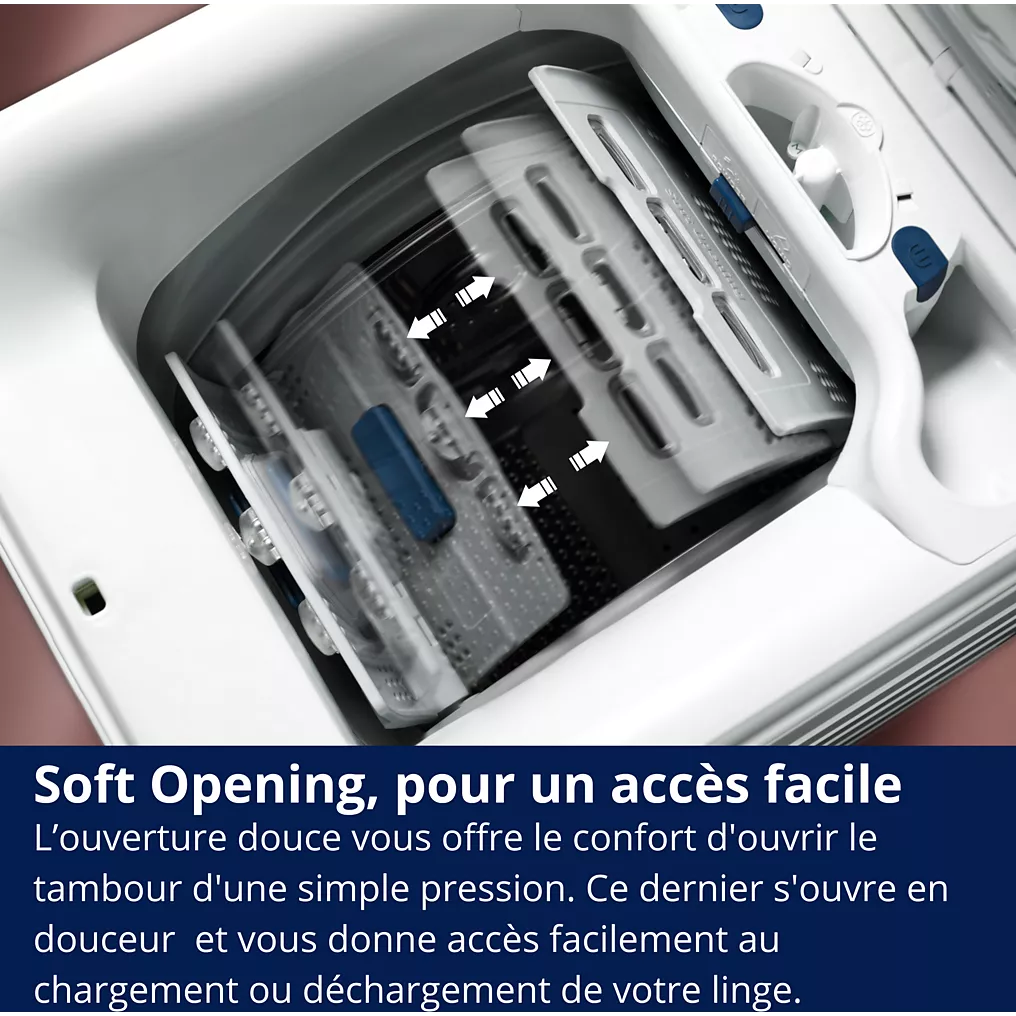- Ouverture du tambourdouce, permet l’ouverture du tambour d’une seule main, tout en douceur. Il offre davantage de sécurité et de praticité lors du chargement et du déchargement du linge.