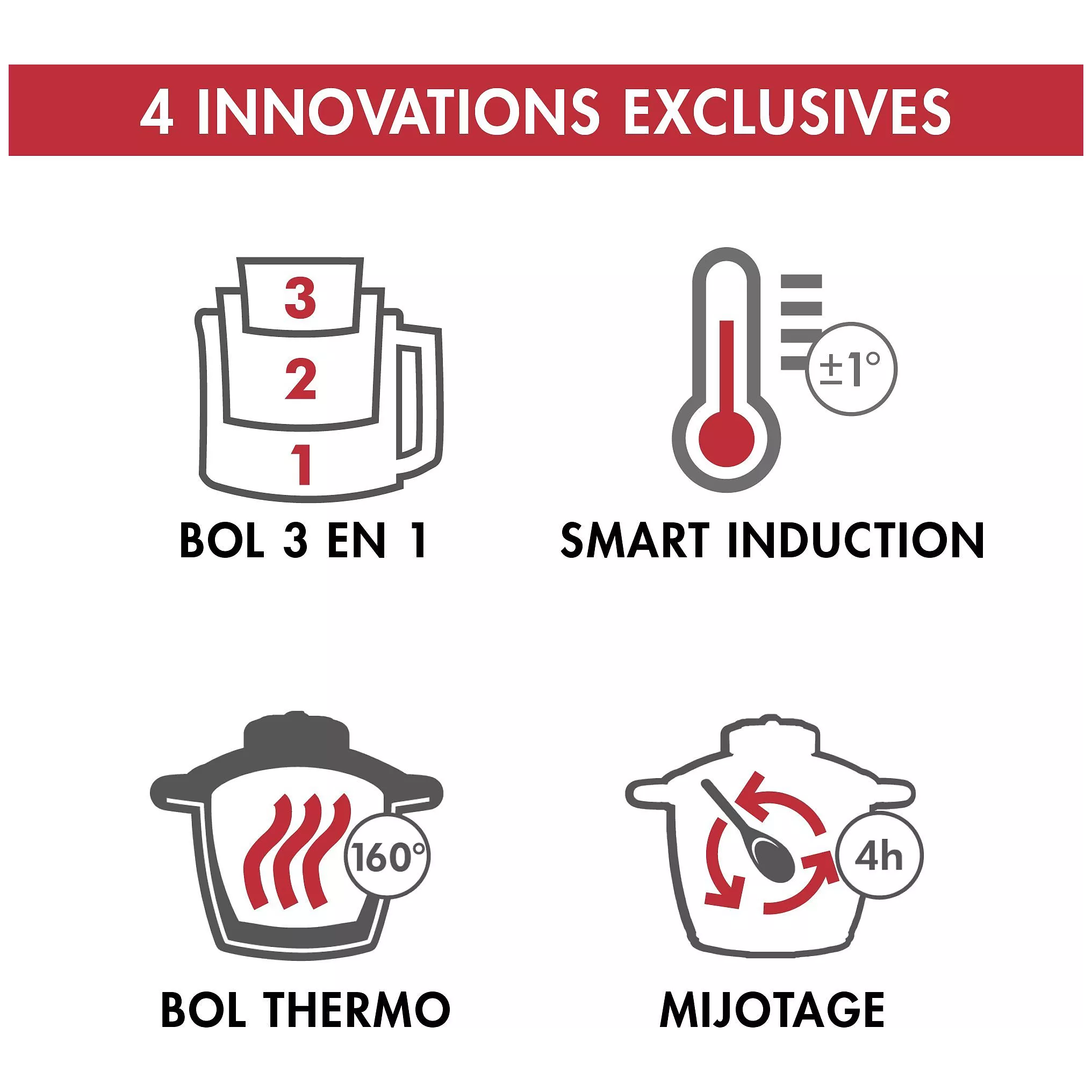 Avec son bol thermo inox de 3,5 L et ses 3 bols multifonction, il cuit, coupe, mélange, hache, râpe, mijote, pétrit et pile à la perfection.
