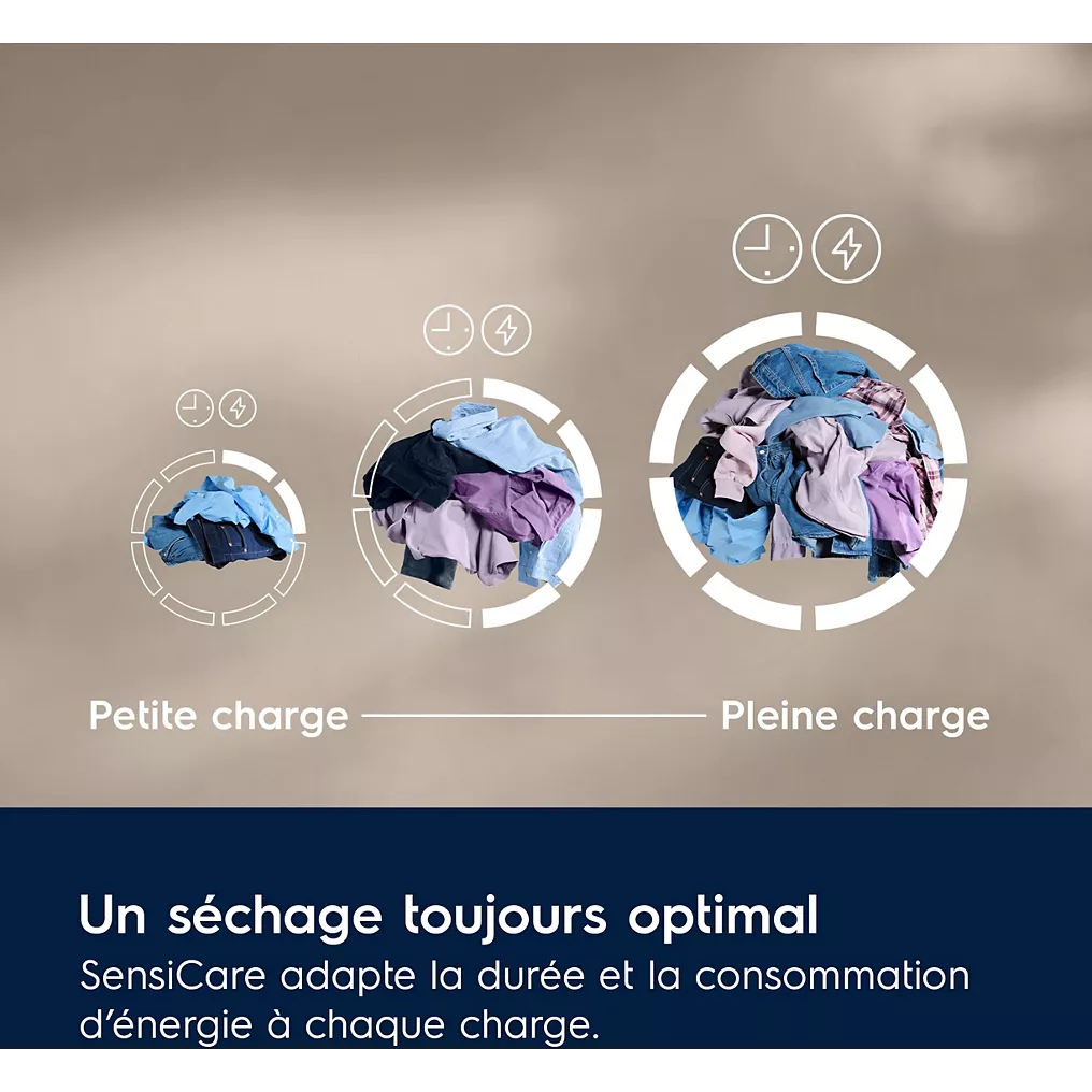 Les capteurs SensiCare mesurent l’humidité du linge en temps réel. Ils ajustent automatiquement la durée et la température du cycle. Le sèche-linge s’arrête dès que le linge est sec, sans consommer d’énergie inutile.